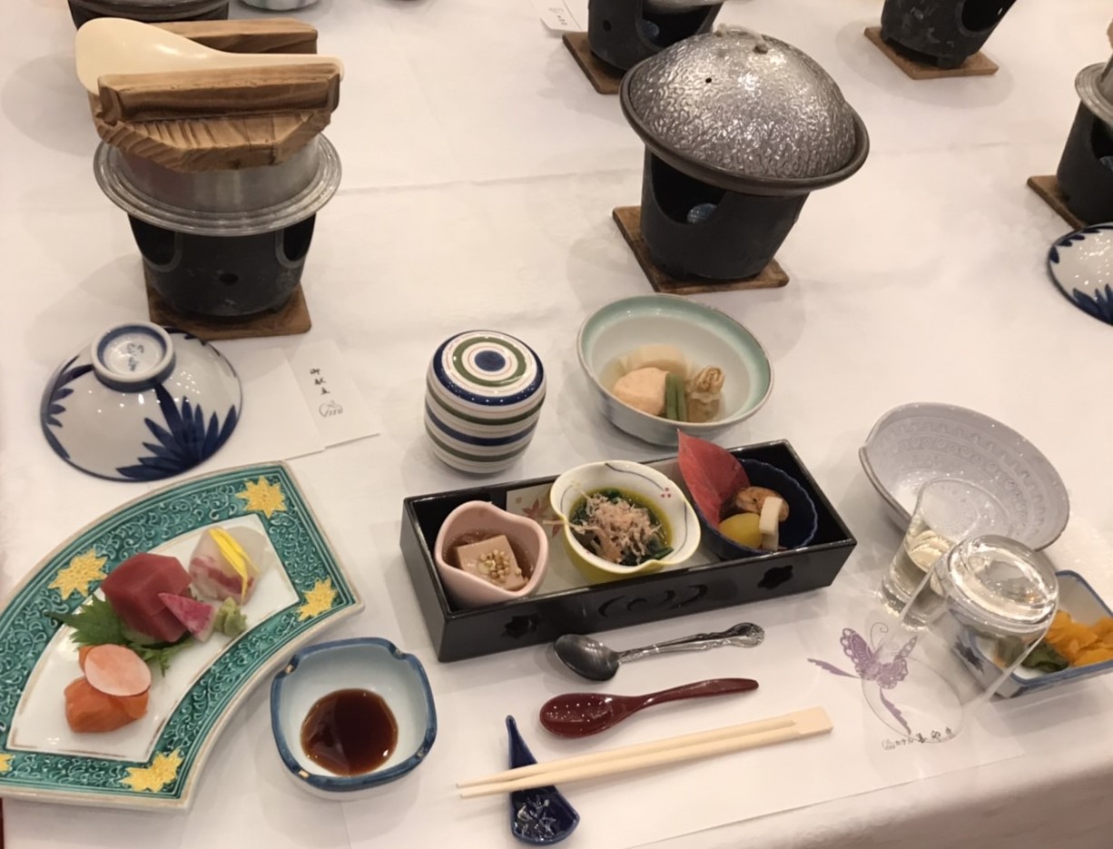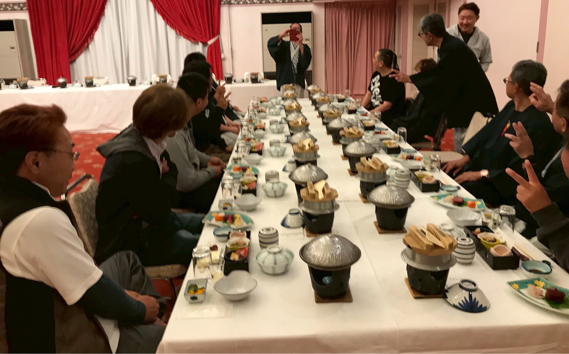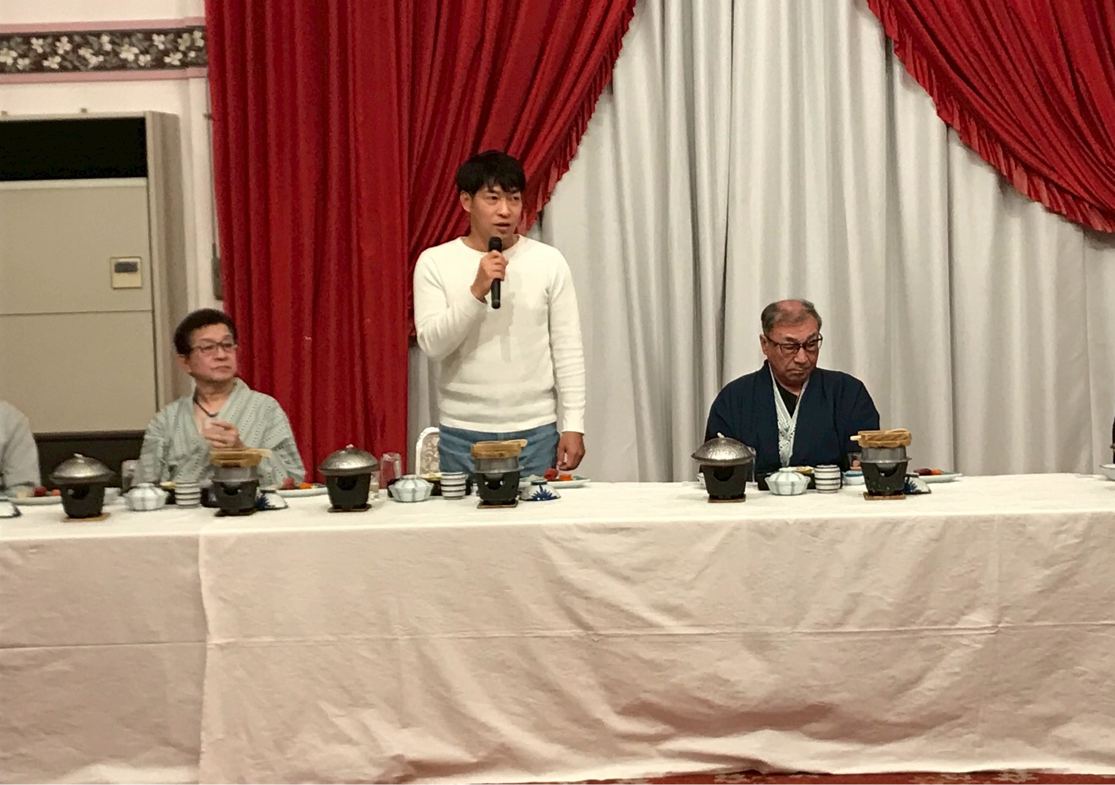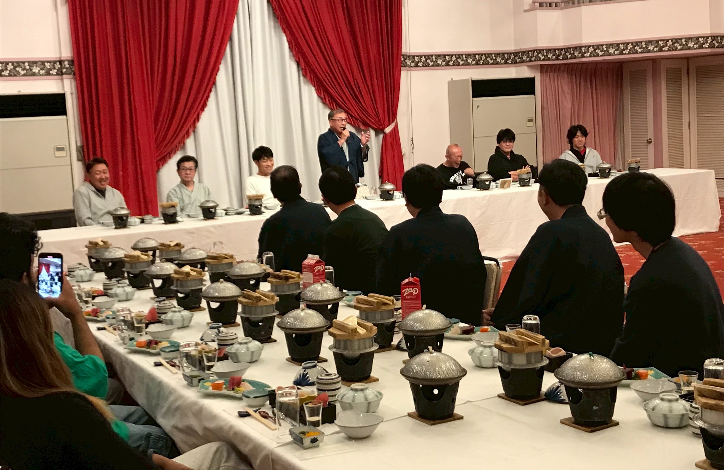 温泉のあとはメインイベントのお食事です。全員揃ったところで、社長から社員への労いの言葉をいただき、専務から乾杯です。献立はゼンマイの胡麻クリーム、秩父産刺身蒟蒻などなど秩父の香りともどもふんだんにいただきます。
